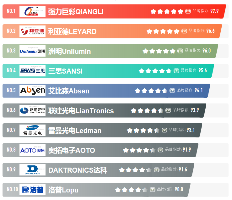 LED顯示屏十大品牌排行:強(qiáng)力巨彩、利亞德、洲明、上海三思、艾比森、聯(lián)建光電、雷曼光電、奧拓電子、羅普等,了解LED顯示屏十大品牌,大家可參照該排名選購,都是知名品牌、實(shí)力資力都很強(qiáng),質(zhì)量靠譜、售后服務(wù)等也很完善,無需擔(dān)憂。